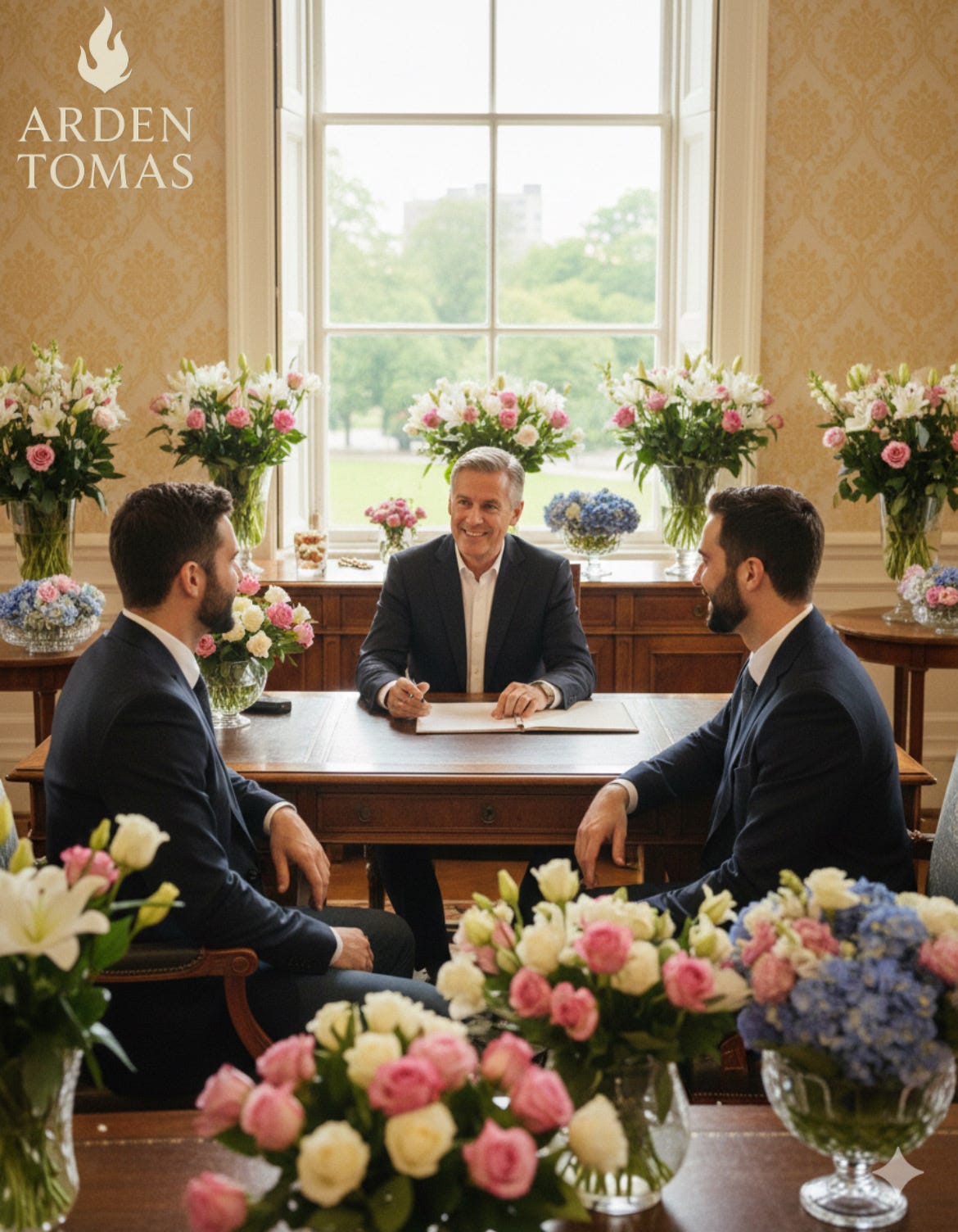 The small-town registrar’s office was an old red-brick building at the end of Main Street, where traffic noise filtered faintly through the open window: horns honking, a dog barking in the distance, someone laughing on the sidewalk. Inside, everything was quiet and intimate. The air carried the scent of fresh coffee mixed with lavender. Daniel, the registrar, clearly loved flowers; a large bouquet of freesias stood on his desk, next to framed family photos: him and his husband on a beach, smiling, hand in hand.